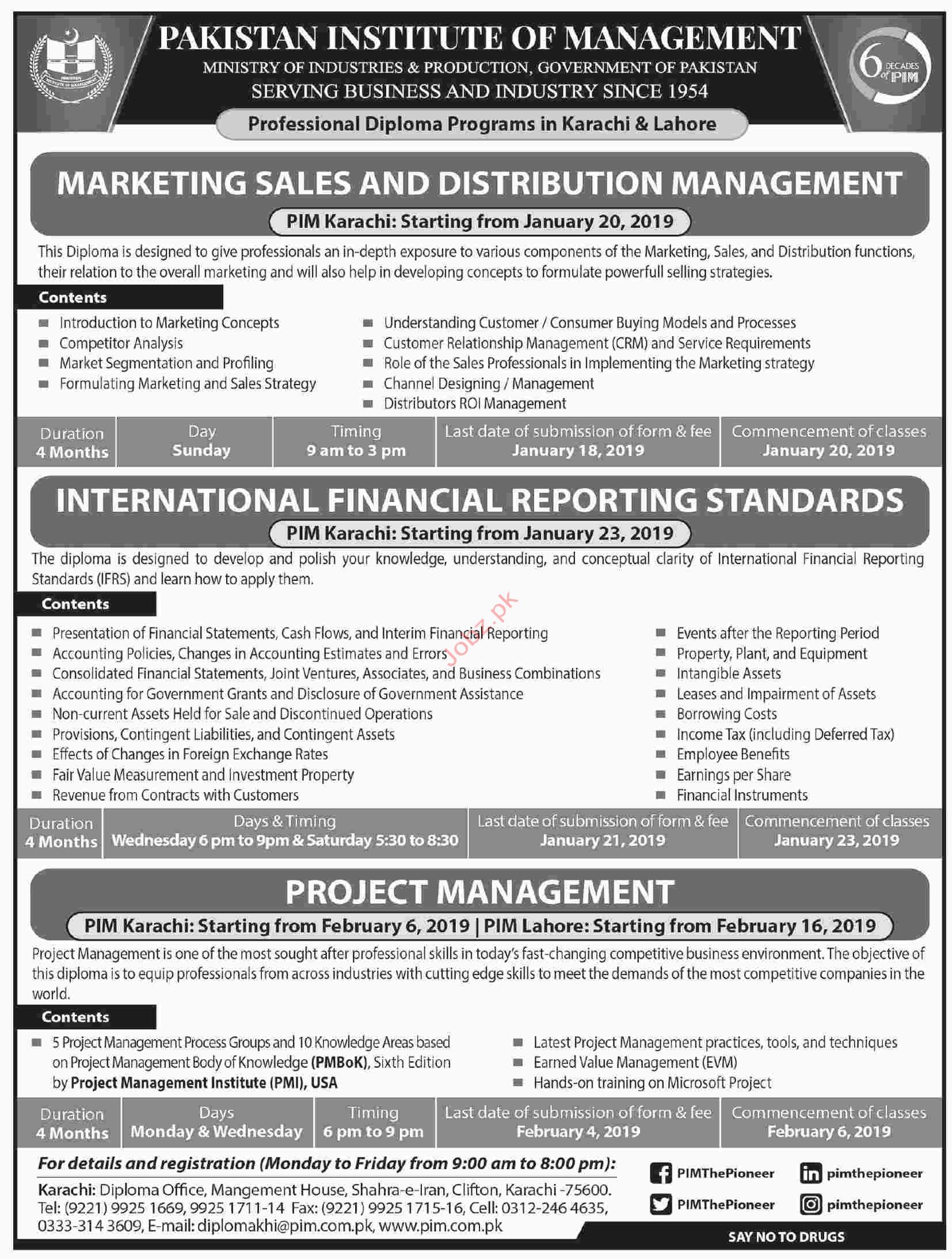 Pakistan Institute of Management Lahore Campus, Pakistan are started admissions spring 2019 for the classes of Diploma in Marketing Sales & Distribution Management. Read newspaper ad for exact details.