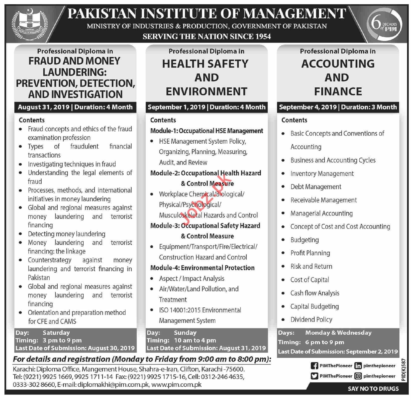 Pakistan Institute of Management, Ministry of Industries & Production, Government of Pakistan are offering admissions in Professional Diploma in Fraud and Money Laundering, Health and Safety, Accounting and Finance in Karachi. Read newspaper ad for exact details.
