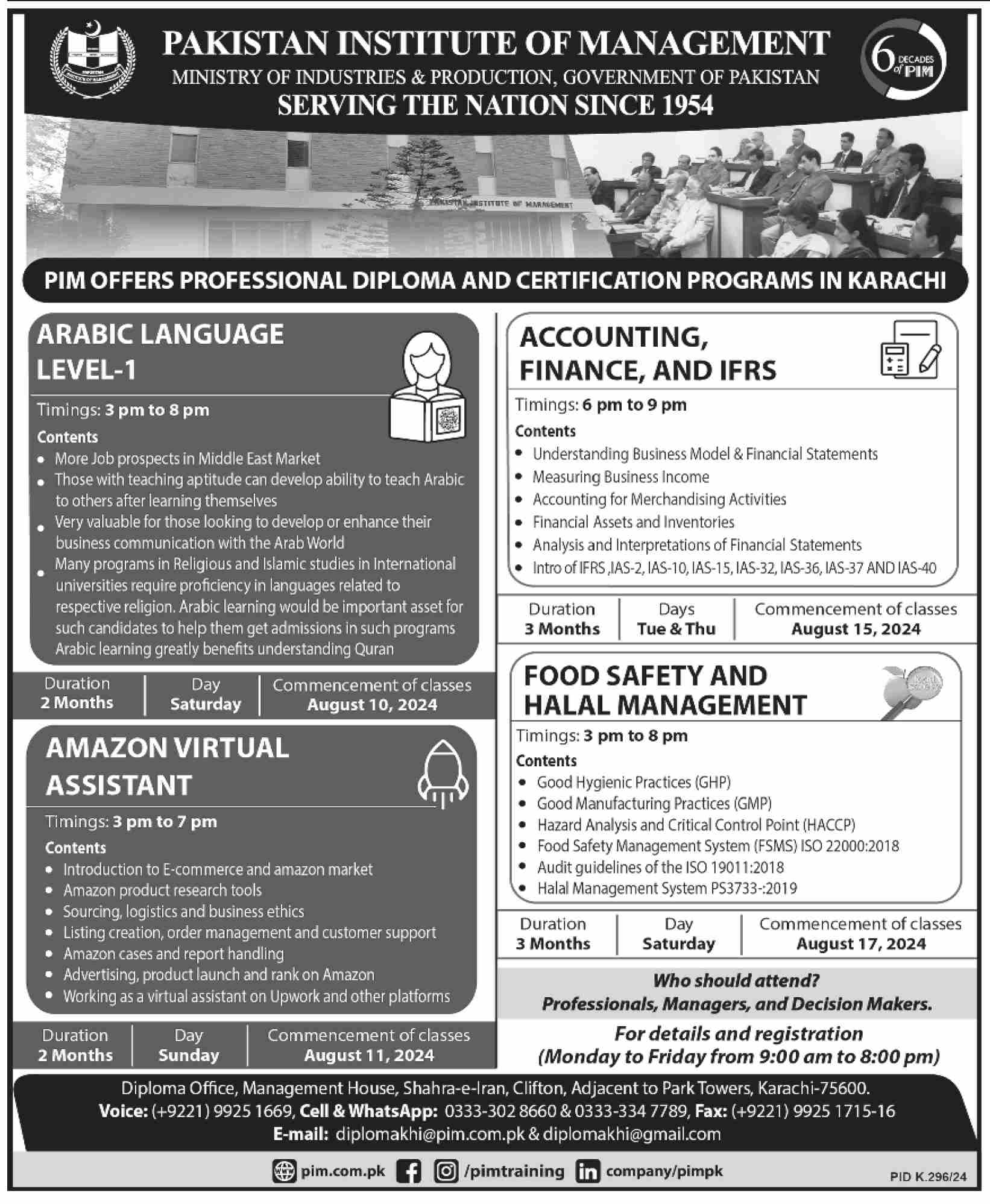 Pakistan Institute of Management admissions 2024 for Arabic Language, Accounting Finance & IFRS, Amazon Virtual Assistant has been announced. Eligible students can apply for academic admissions 2024 in Pakistan Institute of Management Karachi Sindh Pakistan for Teaching Course. Eligible candidates for admissions in Course and Diploma can apply as per Government institute criteria and before closing date 17 August 2024 after reading advertisement online. Read newspaper ad for exact details.