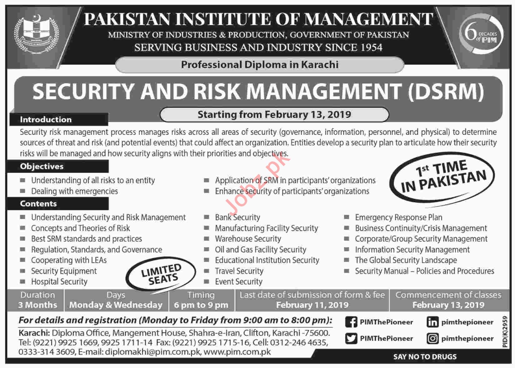 Government of Sindh Pakistan Institute of Management PIM offering admissions for Security and Risk Management DSRM Diploma Program in Karachi Sindh 2019. Read newspaper ad for exact details.