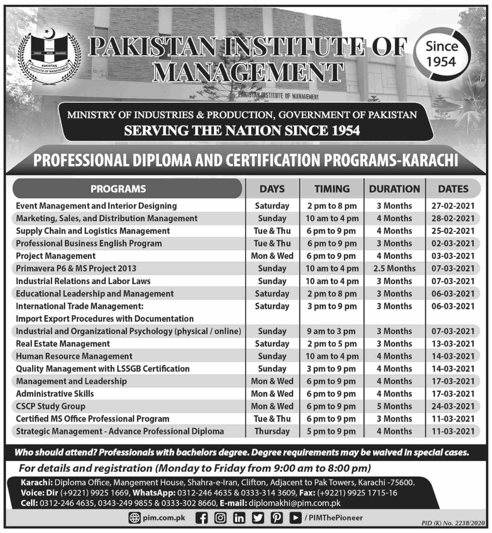 Pakistan Institute of Management Government of Pakistan Ministry of Industries & Production has announced admissions for professional diploma and certification programs in Karachi. Read newspaper ad for exact details.