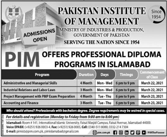 Pakistan Institute of Management Government of Pakistan Ministry of Industries & Production is offering admissions for professional diploma in Administrative and Managerial Skills, Industrial Relations and Labor Laws, Project Management, Accounting and Finance. Read newspaper ad for exact details.