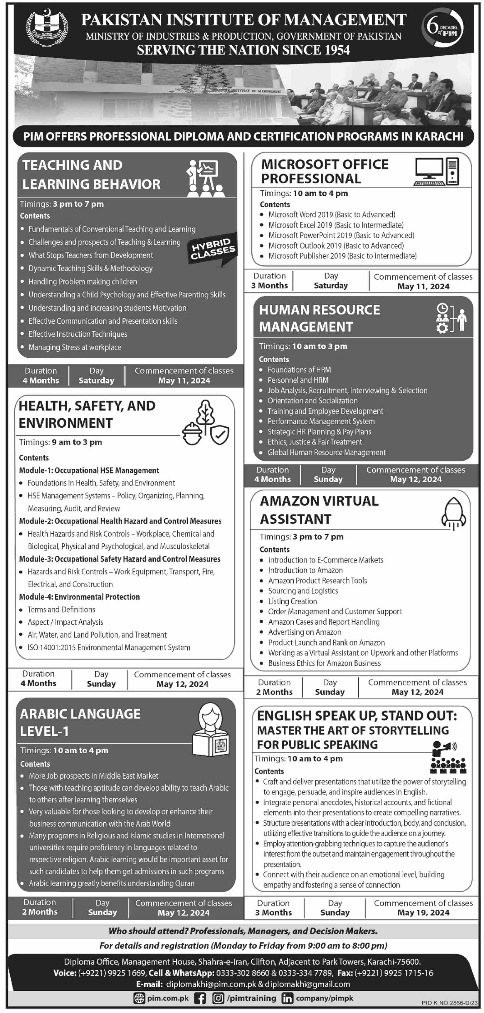 Pakistan Institute of Management Teaching and Learning Behavior, Health, Safety and Environment, Arabic Language, Microsoft Office Professional, Human Resource Management, Amazon Virtual Assistant, English Speak Up, Stand Out admissions 2024 has been announced. Students who want to take admissions in Pakistan Institute of Management Karachi Sindh Pakistan for academic year 2024 to continue education in Management College can apply. Eligible candidates for admissions in Diploma and Course can apply as per Government institute criteria and before closing date 29 April 2024 after reading advertisement online. Read newspaper ad for exact details.