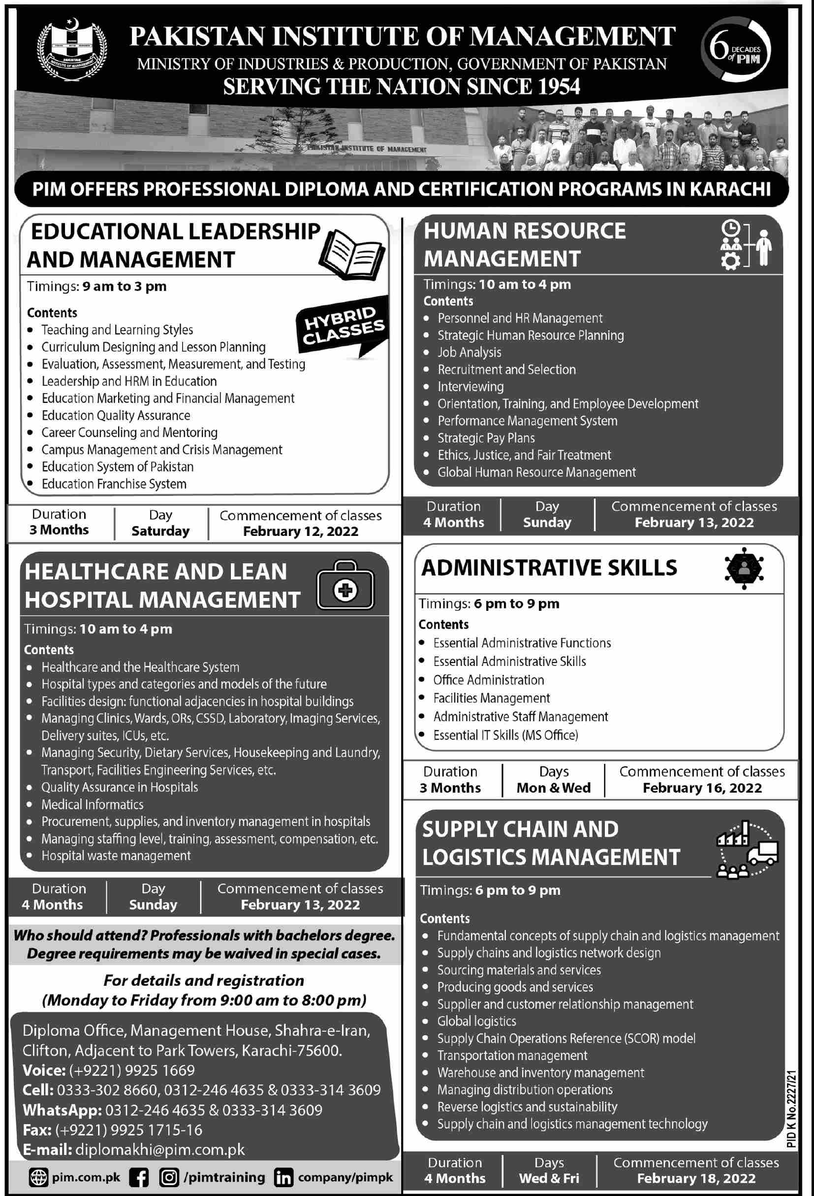 Pakistan Institute of Management has announced admissions 2022 for . Students can enroll for admissions in Pakistan Institute of Management Karachi Sindh Pakistan for academic year 2022 to continue campus based or online education in Other College. Eligible candidates for admissions in P.G Diploma and Diploma can apply as per Government institute criteria and before closing date 18 February 2022 after reading advertisement online. Read newspaper ad for exact details.