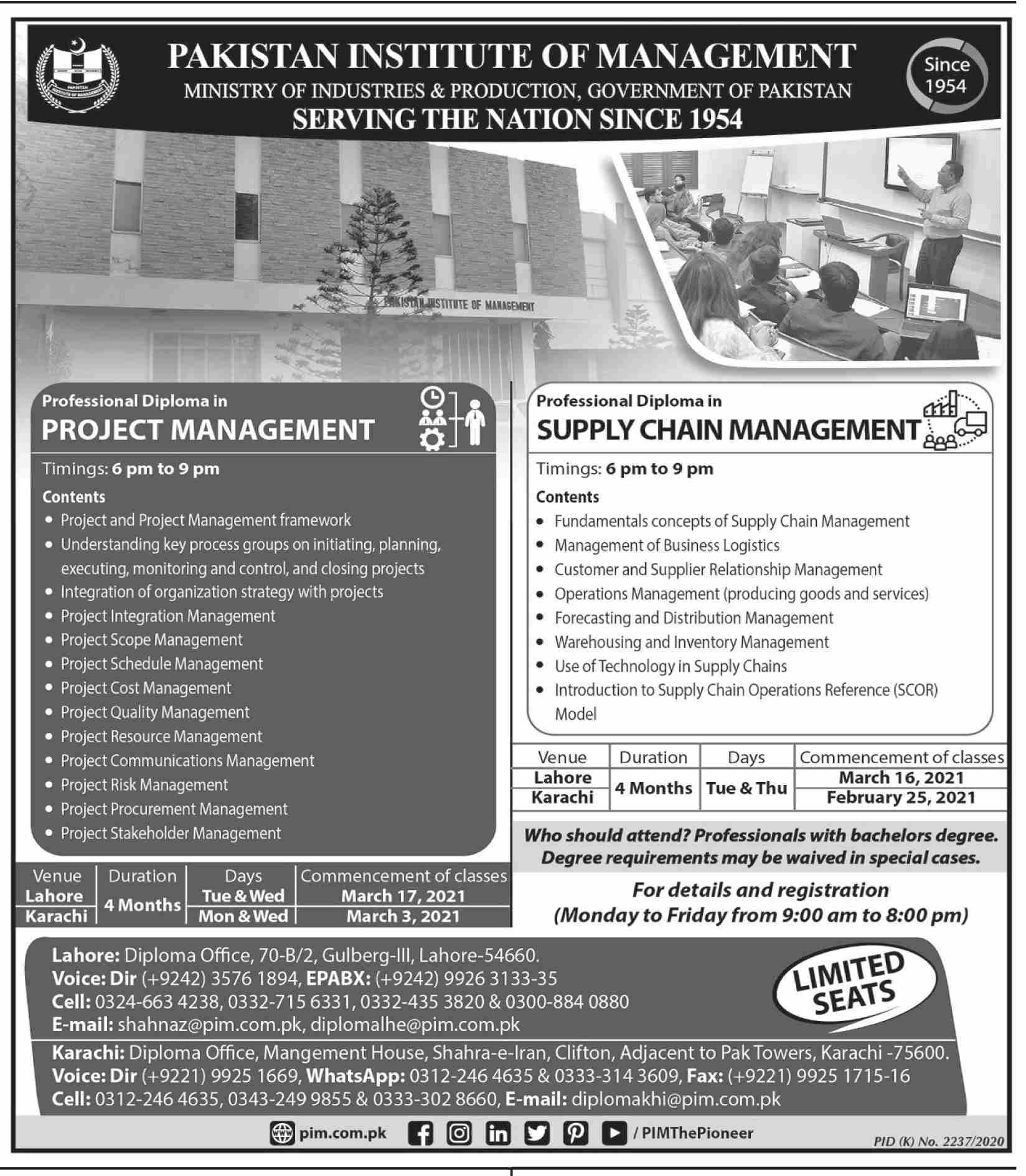 Pakistan Institute of Management Government of Pakistan Ministry of Industries & Production is offering admissions for professional diploma in Project Management & Supply Chain Management in Karachi. Read newspaper ad for exact details.