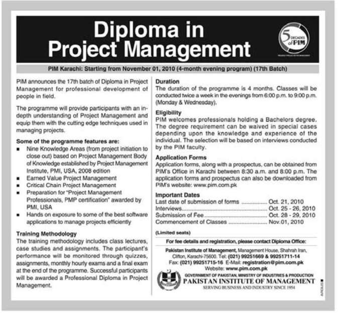 Admission in Diploma in Pakistan Institute of Management Karachi Offering Professional Courses Read newspaper ad for exact details.