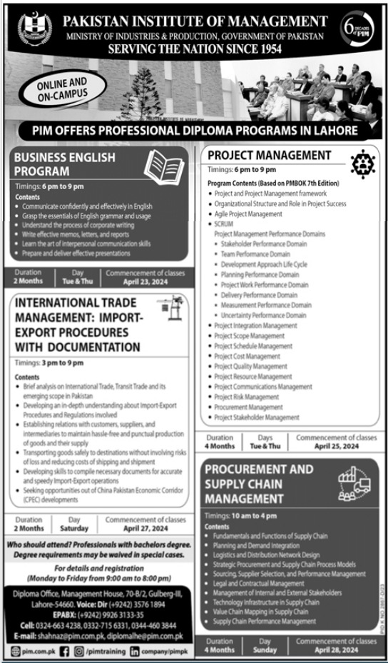 Pakistan Institute of Management Business English Program, International Trade Management, Project Management, Procurement and Supply Chain Management admissions 2024 has been announced. Students can enroll for admissions in Pakistan Institute of Management Lahore Punjab Pakistan for academic year 2024 to continue campus based or online education in Management Diploma. Eligible students for fulfilling criteria for admissions in Diploma can enroll as per Government admission policy 2024 till closing date 29 April 2024. Read newspaper ad for exact details.