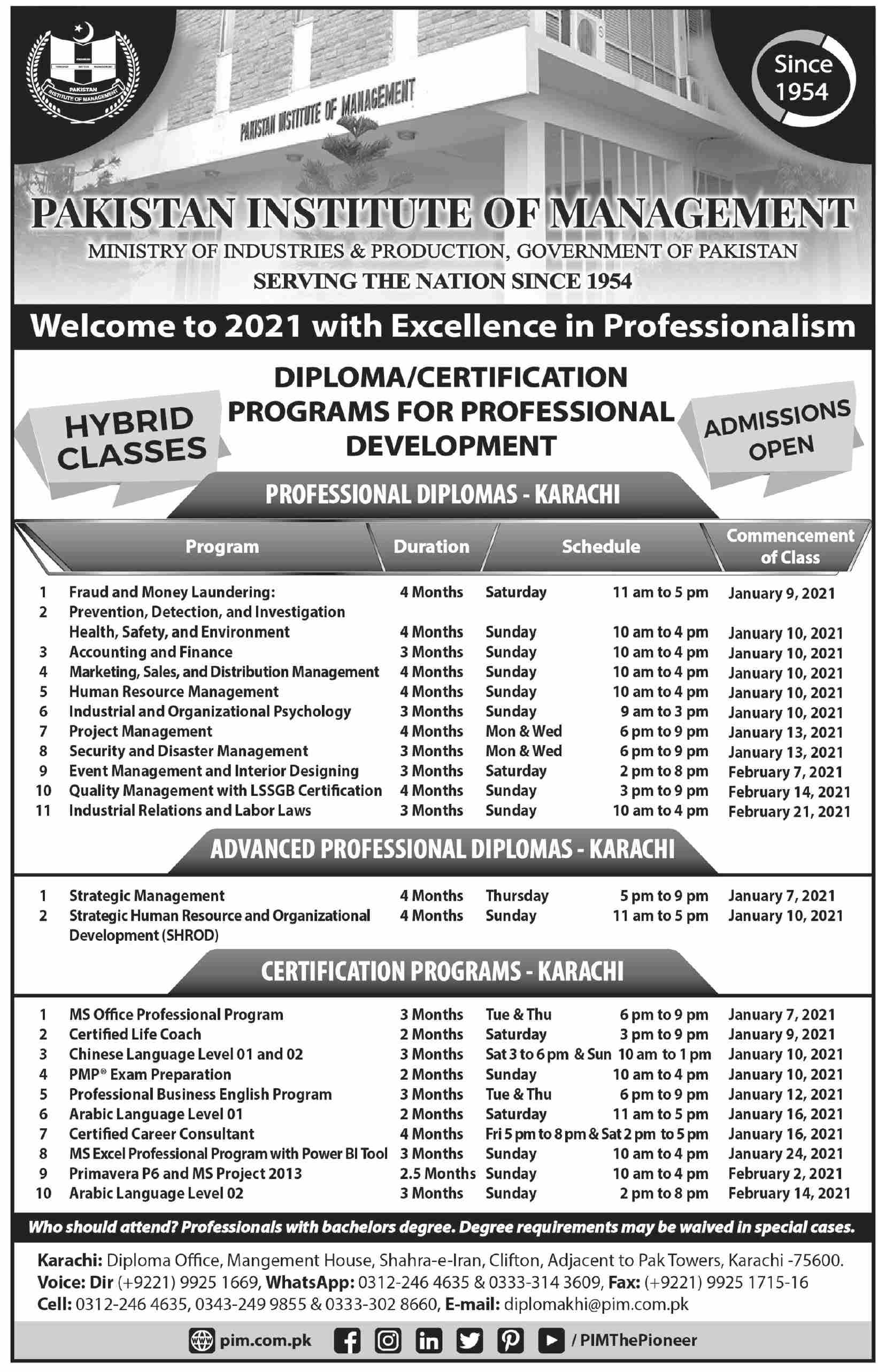Pakistan Institute of Management Government of Pakistan Ministry of Industries & Production has announced online admissions in Diploma & Certification Programs For Professional Development. Read newspaper ad for exact details.