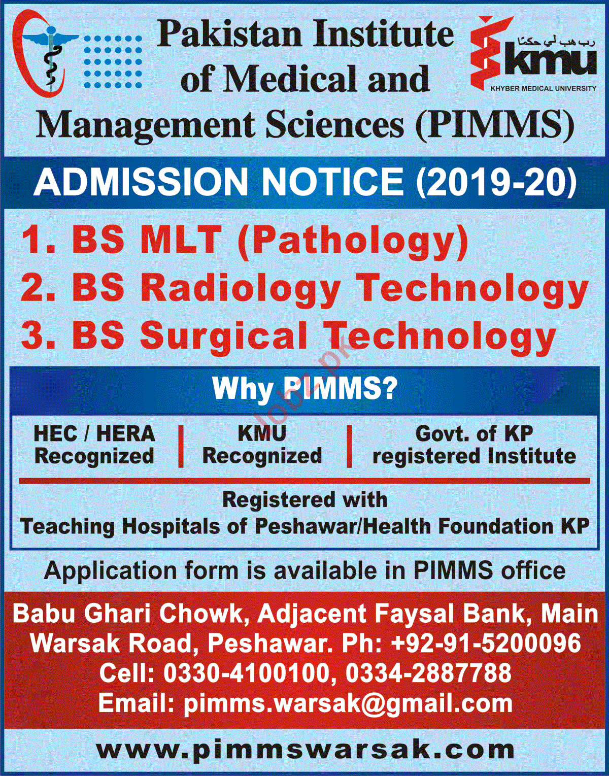 Pakistan Institute of Medical & Management Sciences PIMMS is offering admissions in BS MLT Pathology, BS Radiology Technology, BS Surgical Technology in Peshawar. Pakistan Institute of Medical & Management Sciences PIMMS is recognized from HEC, HERA, Recognized from Khyber Medical University KMU. Read newspaper ad for exact details.