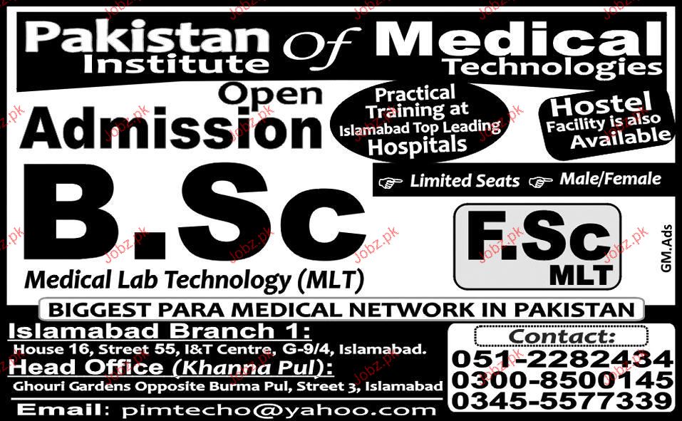 Pakistan Institute of Medical Technology Admission in BSc in Islamabad. Read newspaper ad for exact details.
