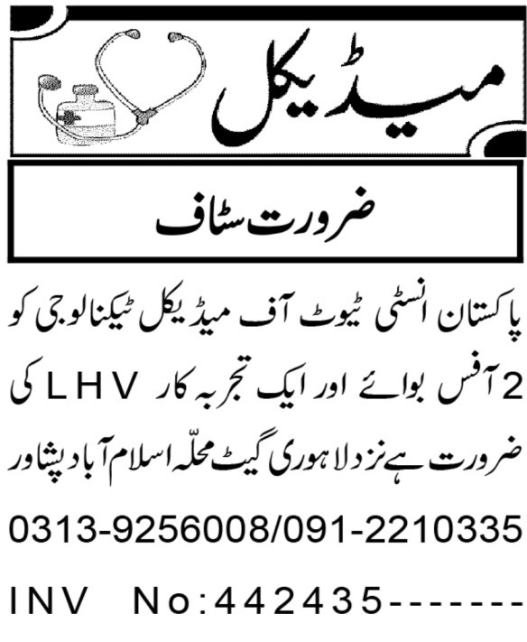 Pakistan Institute of Medical Technologies PIMT Lahori Gate Peshawar, peshawar Khyber Pakhtunkhwa KPK Pakistan invites applications from eligible candidates for the post of office boy and lhv as per advertisement of June 13, 2025 published in daily Aaj Newspaper. Intermediate and Matric etc. educational qualification will be preferred.