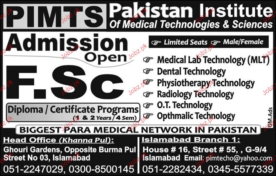 Pakistan Institute of Medical Technology & Sciences Admission in Fsc in Islamabad. Read newspaper ad for exact details.
