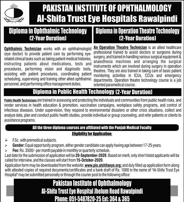 Pakistan Institute of Ophthalmology, Al Shifa Trust Eye Hospitals Rawalpindi has announced admissions for Diplomas in Ophthalmic Technology, Operation Theater Technology & Public Health Technology. Read newspaper ad for exact details.