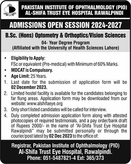 Admissions in Pakistan Institute of Ophthalmology 2023 for Bsc Hons. In Optometry & Orthoptics, BSc Vision Sciences has been announced. Students who want to take admissions in Pakistan Institute of Ophthalmology Rawalpindi Punjab Pakistan for academic year 2023 to continue education in Medical Medical College can apply. Students for admissions in BS Hons and Bachelor & criteria can apply as per Government institute admission policy 2023 before closing date December 2, 2023 as per advertisement. Read newspaper ad for exact details.