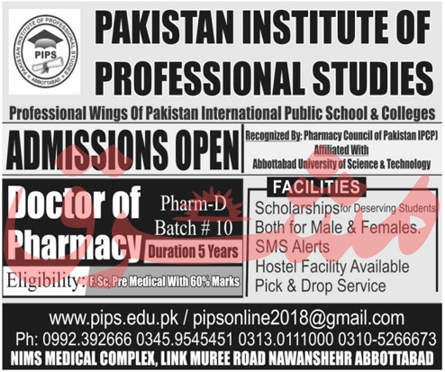 Pakistan Institute of Professional Studies PIPS, Professional Wings of Pakistan International Public School & Colleges has announced admissions for Doctor of Pharmacy Pharm-D in Abbottabad KPK. Read newspaper ad for exact details.