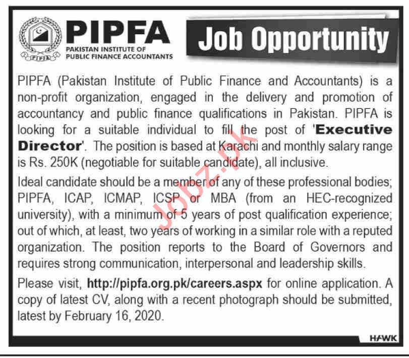 Pakistan Institute of Public Finance Accountant PIPFA is well known non profit organization invites applications from well experienced, hardworking and well qualified candidates for the post of Executive Director in Karachi. Candidates must have PIPFA, ICAP, ICMAP, ICSP or MBA Degree.