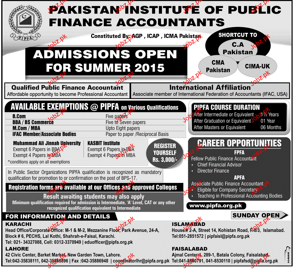 Pakistan Institute of Public Finance Accountants Admission in B.Com, BBA, MBA and B.Com in Karachi. Read newspaper ad for exact details.