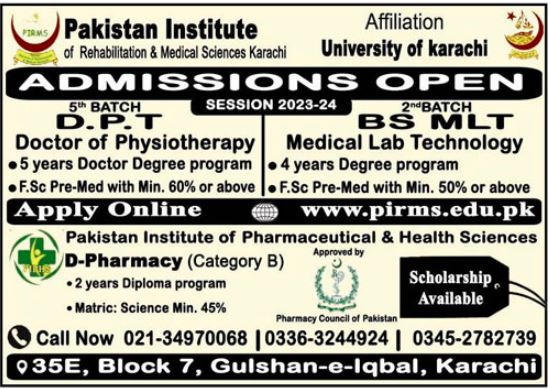 Admissions in Pakistan Institute of Rehabilitation & Medical Sciences PIRMS 2024 for Doctor of Physical Therapy DPT, BS MLT Medical Lab Technologist has been announced. Students who want to take admissions in Pakistan Institute of Rehabilitation & Medical Sciences PIRMS Karachi Sindh Pakistan for academic year 2024 to continue education in Medical Medical College can apply. Eligible candidates for admissions in DPT, BA Hons and BS can apply as per Private institute criteria and before closing date 25 March 2024 after reading advertisement online. Read newspaper ad for exact details.