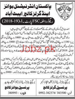 Pakistan International Boys & Girls College Abbottabad Admission in Fsc Part-I Pe Medical, Pre Engineering and Computer Sciences Academic Session 2018-2019 in Abbottabad. Read newspaper ad for exact details.