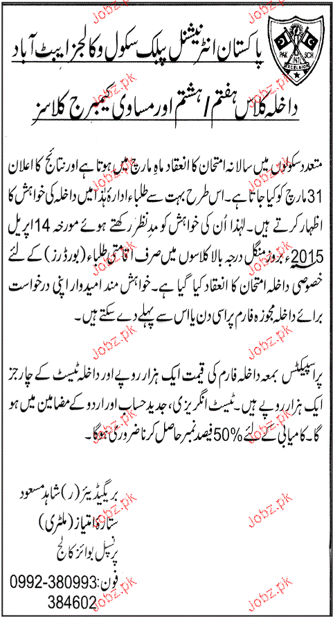 Pakistan International Public School and College Admission in Class VII and VIII in Abbottabad. Read newspaper ad for exact details.