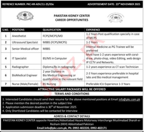 Vacant posts including nurse, anesthetist, ultrasound specialist, radiographer, biomedical engineer, it specialist and medical officer are announced in Pakistan Kidney Center PKC Abbottabad, abbottabad Khyber Pakhtunkhwa KPK Pakistan as per 24 November 2025 advertisement in daily Jang Newspaper. Persons with Master, MBBS and Bachelor etc. education can apply.