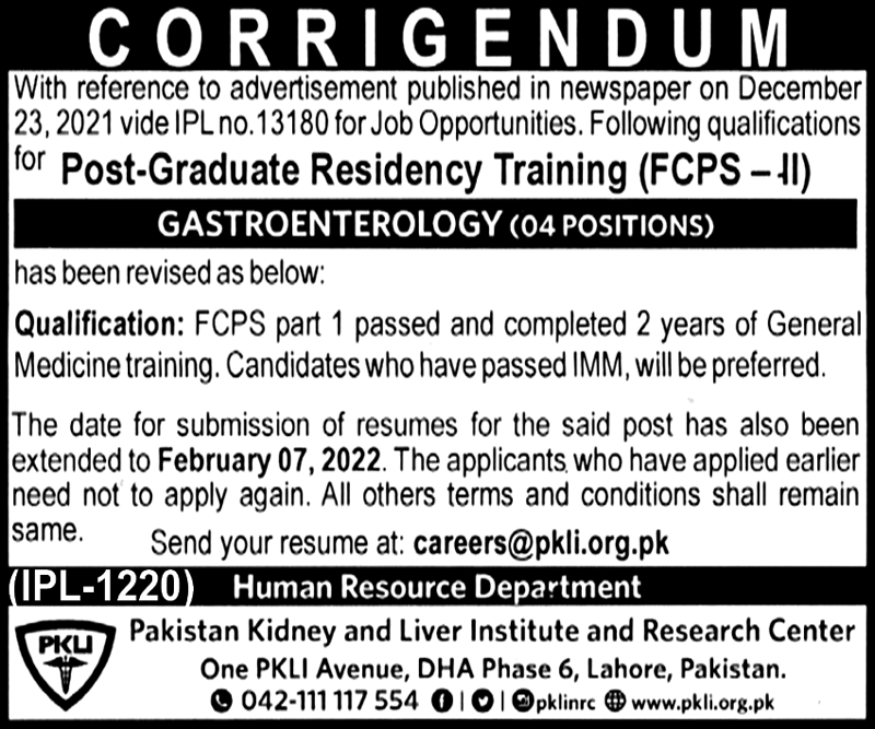 Pakistan Kidney And Liver Institute And Research Centre PKLI Lahore Punjab Pakistan invites applications from eligible candidates for the post of FCPS-II Gastroenterology Trainee and Post Graduate Residency Trainee as per advertisement of February 3, 2022 published in daily Nawaiwaqt Newspaper. Preferred Education is Others and MBBS etc.