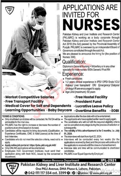 Pakistan Kidney And Liver Institute And Research Centre PKLI Lahore, lahore Punjab Pakistan invites applications from eligible candidates for the post of nurse as per advertisement of April 7, 2024 published in daily Jang Newspaper. Educational qualifications required Bachelor and Intermediate etc.