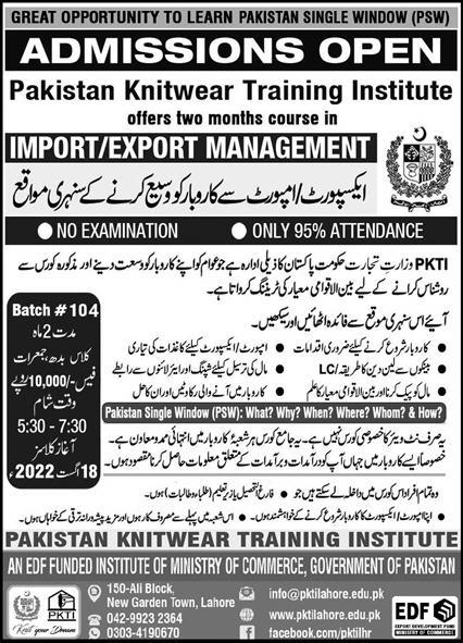 Pakistan Knitwear Training Institute PKTI Import Management Certificate Course, Export Management Certificate Course, admissions 2022 has been announced. Pakistan Knitwear Training Institute PKTI Lahore Punjab Pakistan welcomes students to apply for admissions in academic year 2022 in Management Course. Eligible students for fulfilling criteria for admissions in Course can enroll as per Government admission policy 2022 till closing date 17 August 2022. Read newspaper ad for exact details.