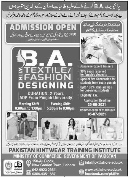 Pakistan Knitwear Training Institute PKTI invites applications for admissions in Bachelor of Arts BA in Textile / Fashion Designing in Lahore Punjab Pakistan 2021. Read newspaper ad for exact details.
