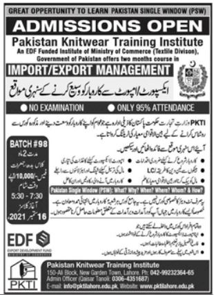 Pakistan Knitwear Training Institute PKTI, An EDF Funded Institute of Ministry of Commerce Textile Division, Government of Pakistan has announced admissions for diploma in Import / Export Management in Lahore 2021. Read newspaper ad for exact details.