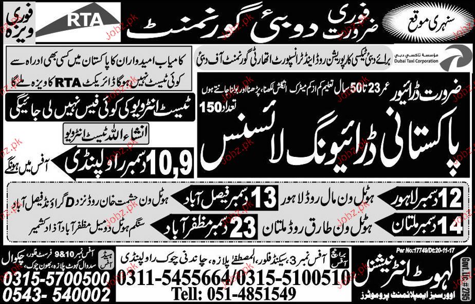 Pakistan License Holder Drivers are required in Dubai Through Kahout International Oversea Employment. Food, Medical and Residence will be provided by the Company. Test and Interview will be held on 13 December 2017.