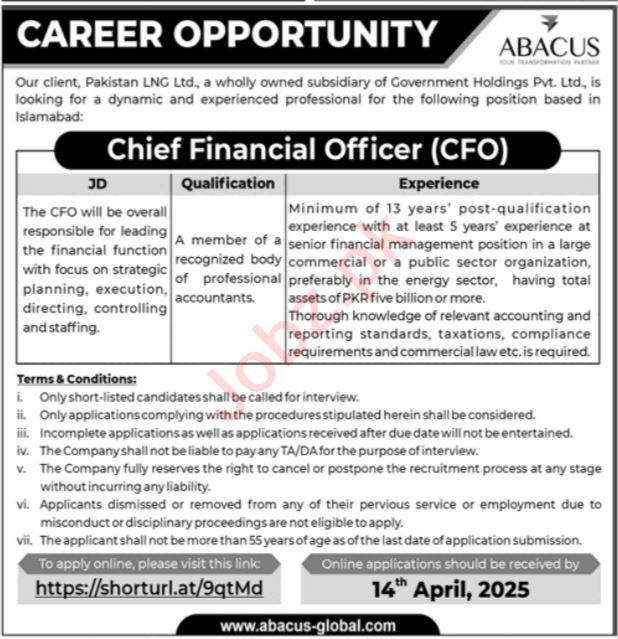 Pakistan LNG Limited PLL jobs advertisement dated about 23 March 2025 in daily Jang Newspaper invites application for the vacant post of chief financial officer in G-5 Islamabad, islamabad Islamabad Pakistan. Persons with Others, Master, MS, CA and Mphil etc. education can apply.
