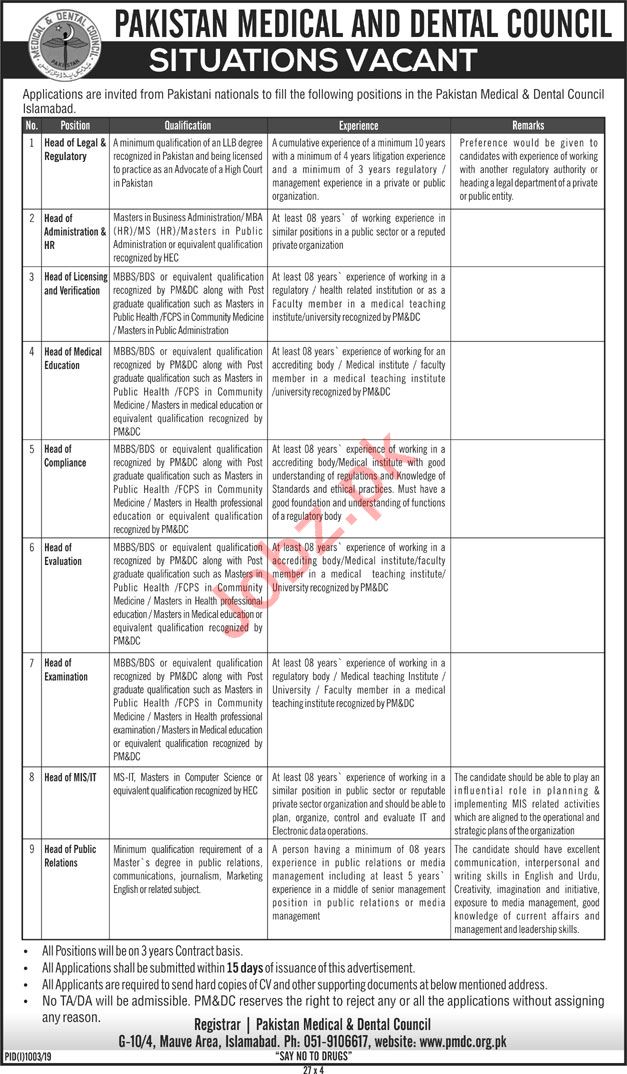 Pakistan Medical & Dental Council PM&DC intends to hire medical, health, mbbs, doctors and experienced individuals for the posts of Head of Legal, Head of Regulatory, Head of Administration, Head of HR, Head of Licensing, Head of Verification, Head of Medical Education, Head of Compliance, Head of Evaluation, Head of Examination, Head of MIS, Head of IT and Head of Public Relation in Islamabad.