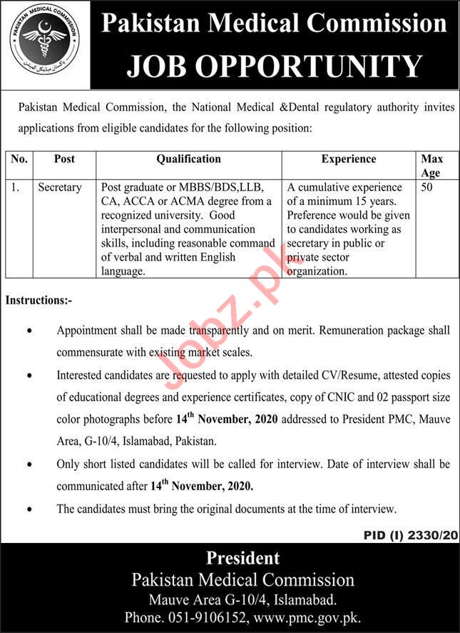 Pakistan Medical Commission PMC Islamabad Jobs For Secretary