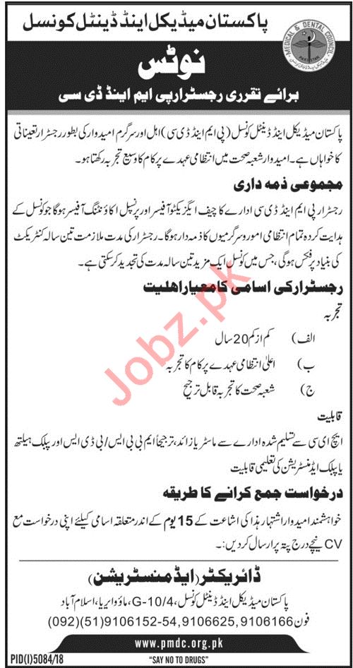 Pakistan Medical & Dental Council PMDC Registrar Jobs 2019