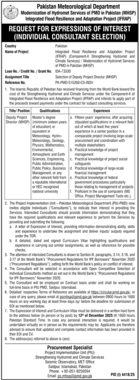 Pakistan Meteorological Department PMD jobs advertisement dated about 28 November 2025 in daily Jang Newspaper invites application for the vacant post of deputy project director in Islamabad, islamabad Islamabad Pakistan. Preferred Education is Bachelor, MS and Master etc.