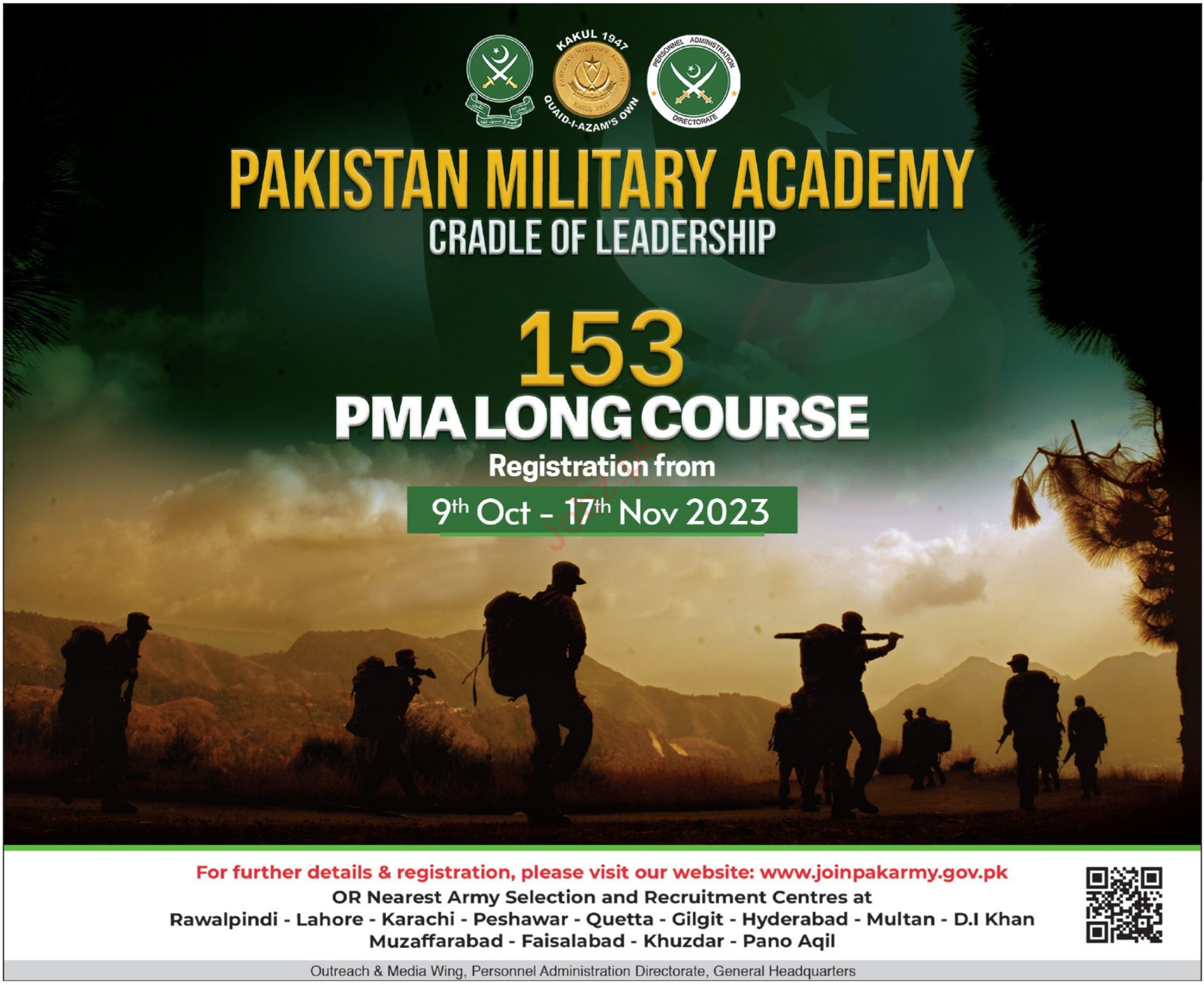 Pakistan Military Academy PMA Abbottabad, peshawar, abbottabad, multan, lahore, karachi and quetta Khyber Pakhtunkhwa KPK Pakistan invites applications from eligible candidates for the post of pma long course as per advertisement of October 8, 2023 published in daily Express Tribune Newspaper. Candidates with Intermediate etc. educational background will be preferred.