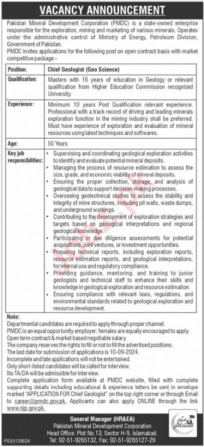 Pakistan Mineral Development Corporation is looking for candidates for following posts as per job advertisement published in daily Jang Newspaper of August 25, 2024 for location Islamabad, islamabad Islamabad Pakistan: