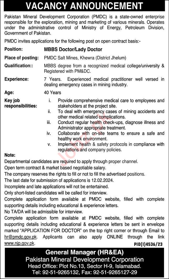 Latest Pakistan Mineral Development Corporation Medical Posts Islamabad 2025