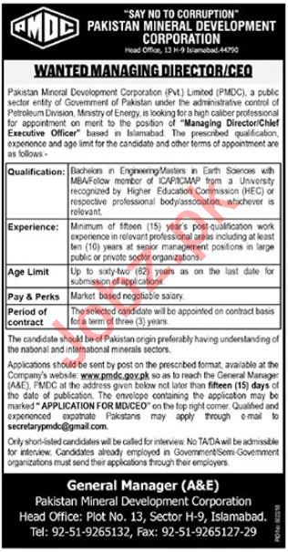 Pakistan Mineral Development Corporation PMDC Jobs 2019