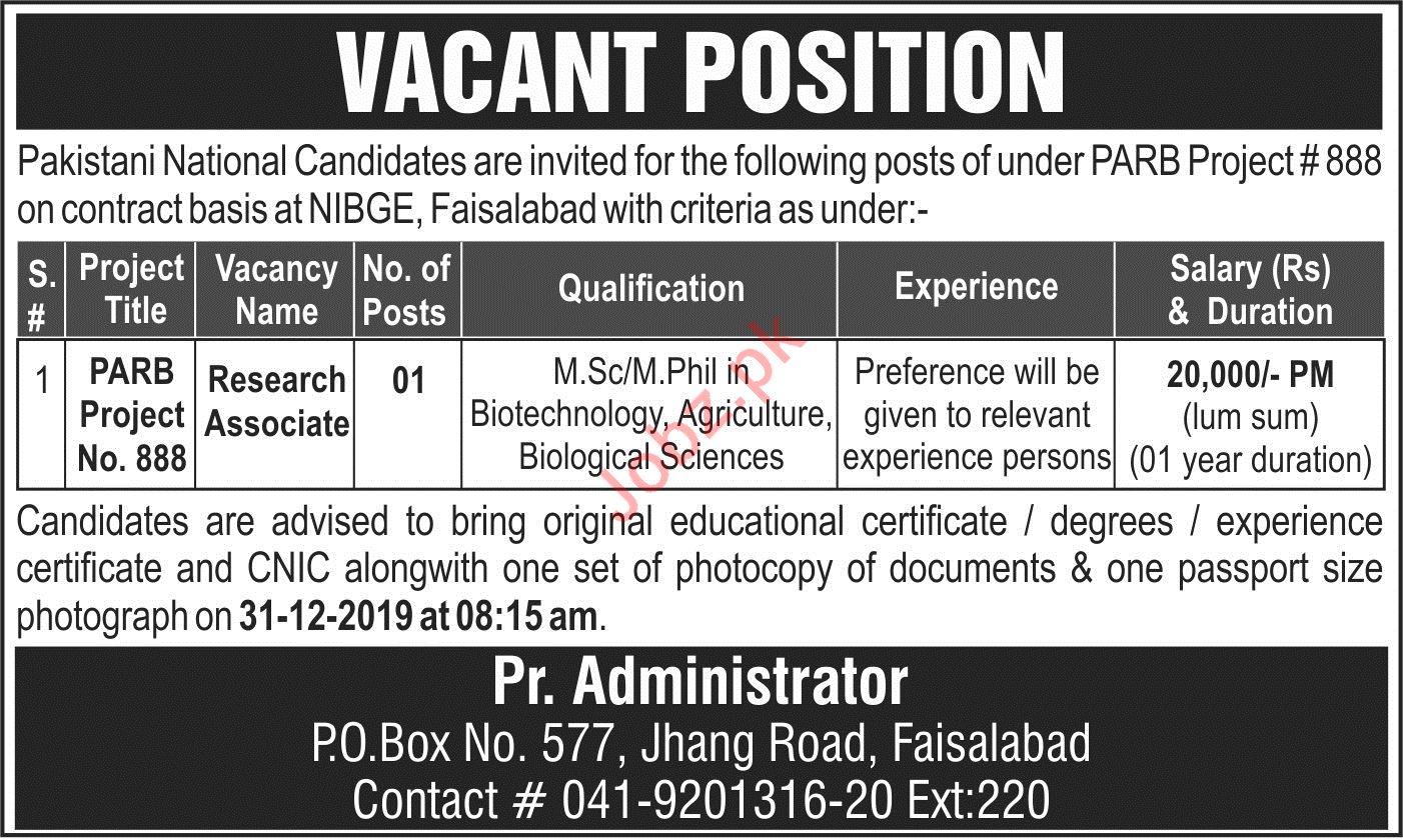 Vacancies in Punjab Agriculture Research Board PARB Advertisement December 2019