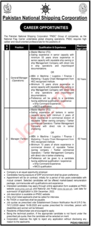 Pakistan National Shipping Corporation PNSC jobs advertisement dated about 4 December 2022 in daily Jang Newspaper invites application for the vacant post of general manager operation and manager in Karachi, karachi Sindh Pakistan. Candidates with Bachelor and Master etc. educational background will be preferred.