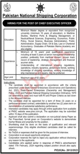 Pakistan National Shipping Corporation PNSC jobs advertisement dated about 17 March 2024 in daily Jang Newspaper invites application for the vacant post of ceo and chief executive officer in Karachi, karachi Sindh Pakistan. Preferred Education is Master etc.