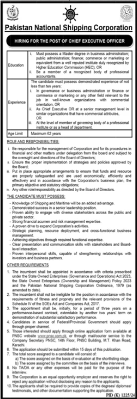 Vacant posts including chief executive officer and ceo are announced in Pakistan National Shipping Corporation PNSC Karachi, karachi Sindh Pakistan as per 20 October 2024 advertisement in daily Jang Newspaper. Master etc. educational qualification will be preferred.