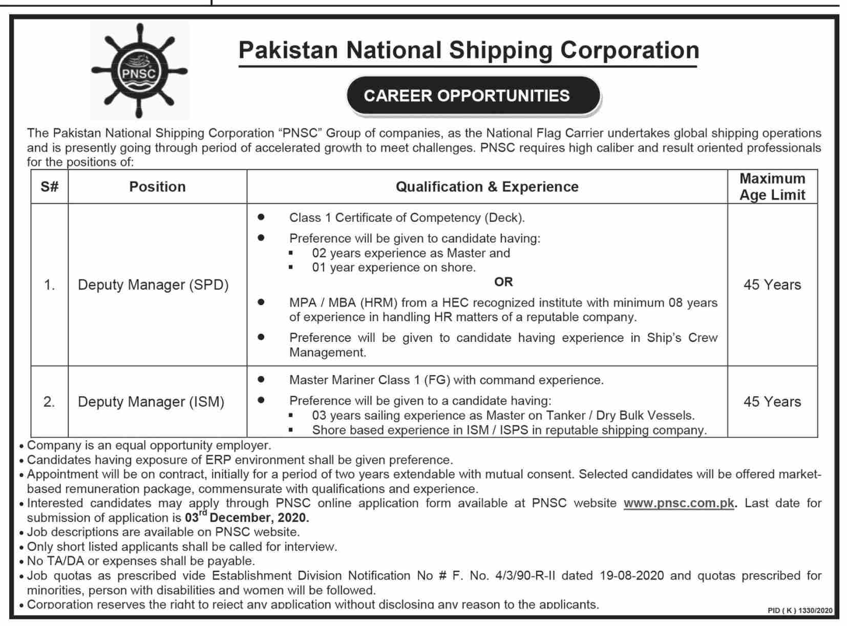Vacancies in Pakistan National Shipping Corporation Advertisement November 2020