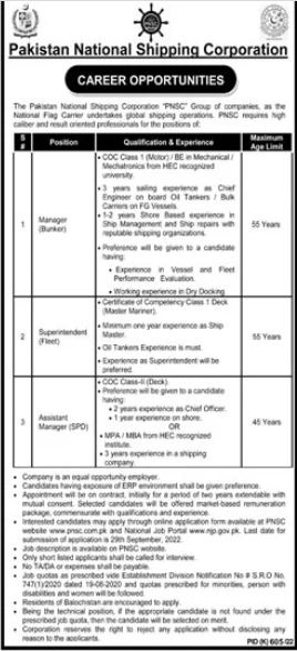 Vacant posts including Superintendent Fleet, Assistant Manager Spd and Manager Bunker are announced in Pakistan National Shipping Corporation PNSC Karachi, karachi Sindh Pakistan as per 12 September 2022 advertisement in daily Jang Newspaper. Educational qualifications required Others, Master and MBA etc.