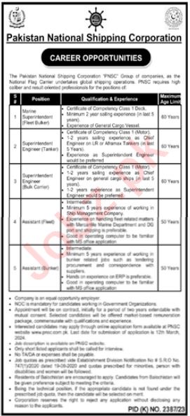 Vacant posts including Marine Superintendent, Superintendent Engineer Bulk Carrier, Assistant Fleet, Superintendent Engineer Tanker and Assistant Bunker are announced in Pakistan National Shipping Corporation PNSC Karachi, karachi Sindh Pakistan as per 25 February 2024 advertisement in daily Jang Newspaper. Intermediate and Bachelor etc. educational qualification will be preferred.