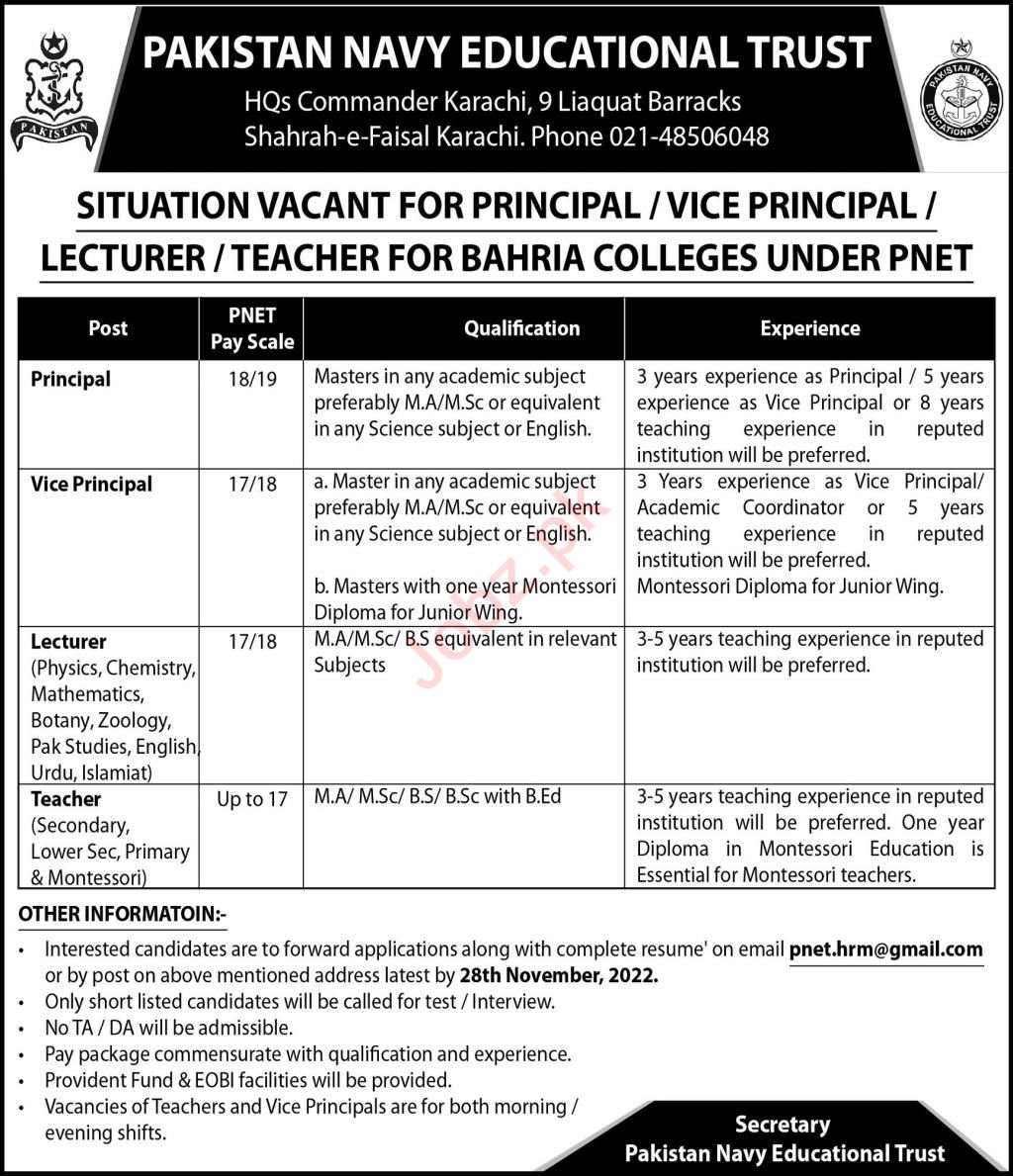 Vacancies in Pakistan Navy Educational Trust Advertisement November 2022