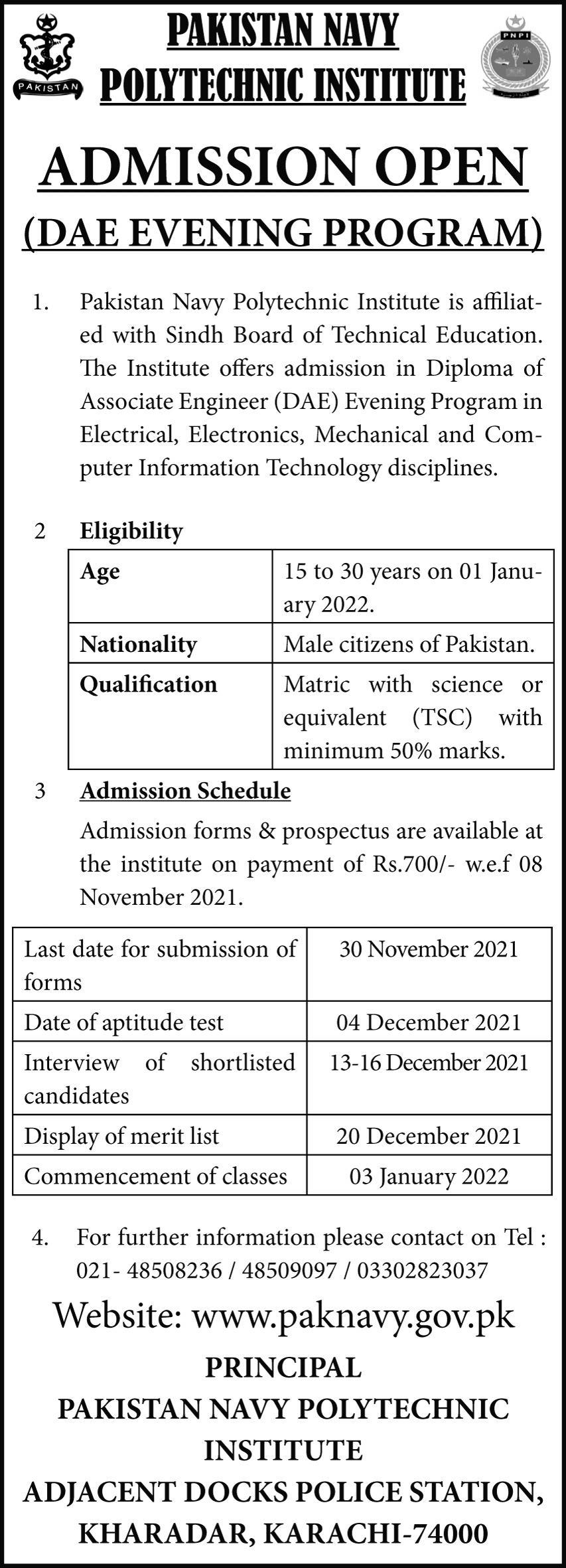 Pakistan Navy Polytechnic Institute has announced admissions for classes of DAE in Electrical, Electronics, Mechanical and Computer Information Technology disciplines in evening program. Read newspaper ad for exact details.