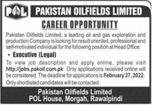 Latest Legal jobs and others Government jobs in Pakistan Oilfield closing date is around February 27, 2022, see exact from ad. Read complete ad online to know how to apply on latest Pakistan Oilfield job opportunities.